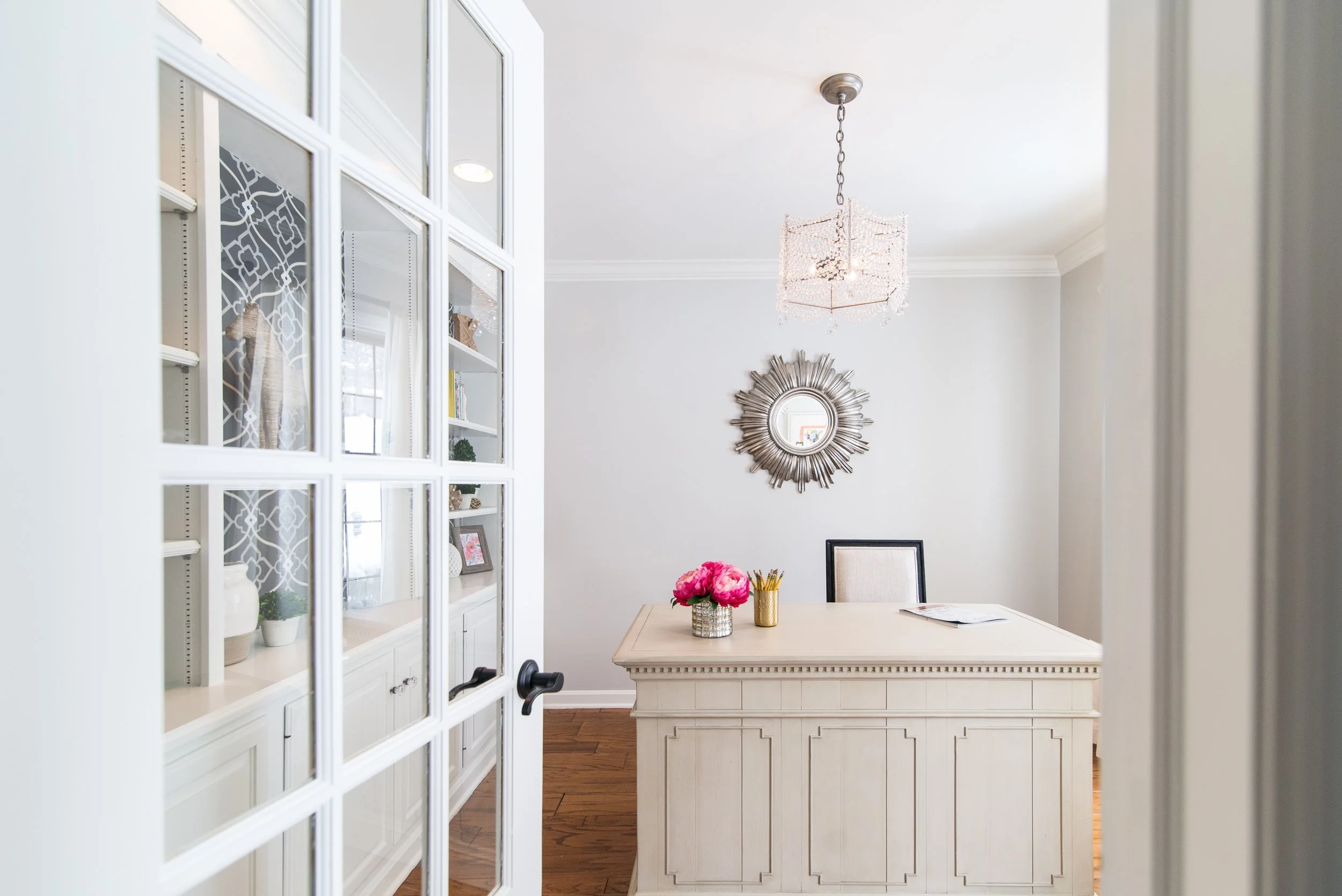 A home office gets a neutral themed makeover! The homeowner works from home and wanted an office that reflected her personality. The entire office was designed around the wallpaper selection, which we used to add texture and contrast to the space. The result is a serene retreat with subtle pops of color to add interest!